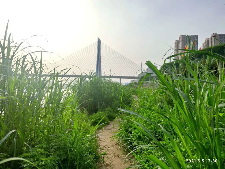 从集散中心到和平公园,见江边有泥土小道可走,我下到江边。这里,暖阳清照,江水微荡,青草飘摇,蝶飘鸟鸣。
