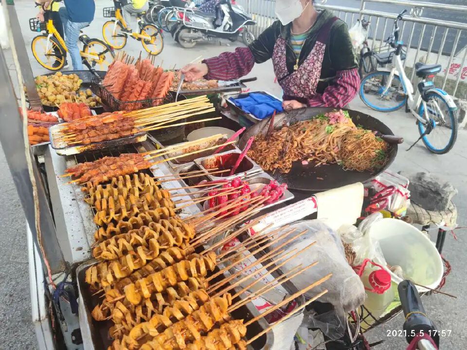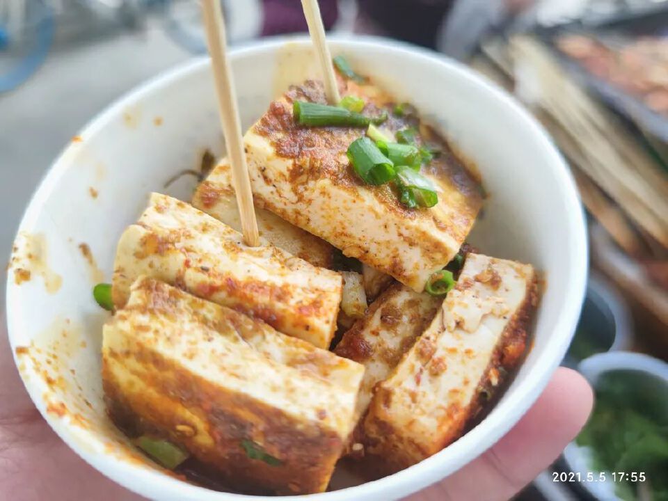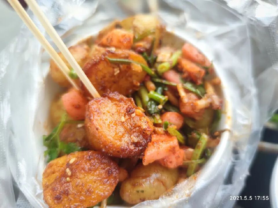 爬上爬下,加上桥下三轮小吃很多,我没忍住即将的夜市,点了小土豆和煎豆腐。