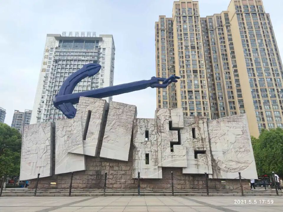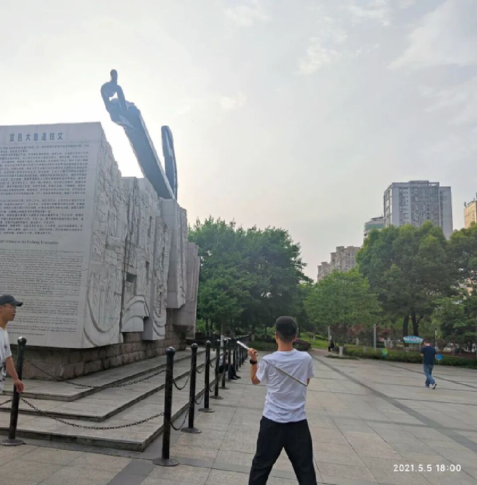 边吃边走,经宜昌大撤退的浅浮雕。绕到里边,有个小伙子正在练双截棍。