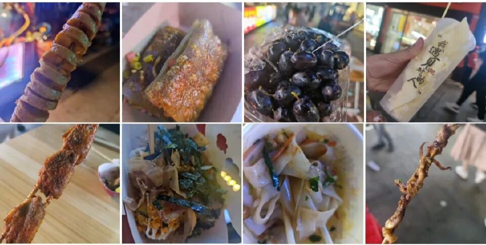 广场东北角,有个50m左右的夜市摊点(西南边也有,但人少),好几天没有吃好,见着这些特色不多的食物(面皮和蕨饼很赞),一点也不挑剔的,分分钟,七八样下肚。
