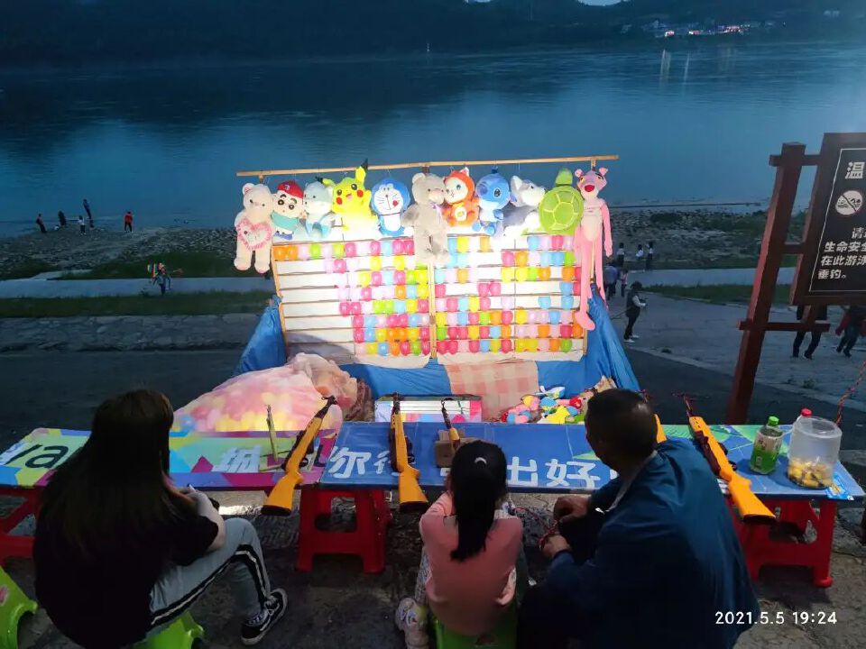 河堤玩气枪的摊位,有人正手把手的教导。仔细一看,不是老爸是老板!呵,不打算养家糊口啦?