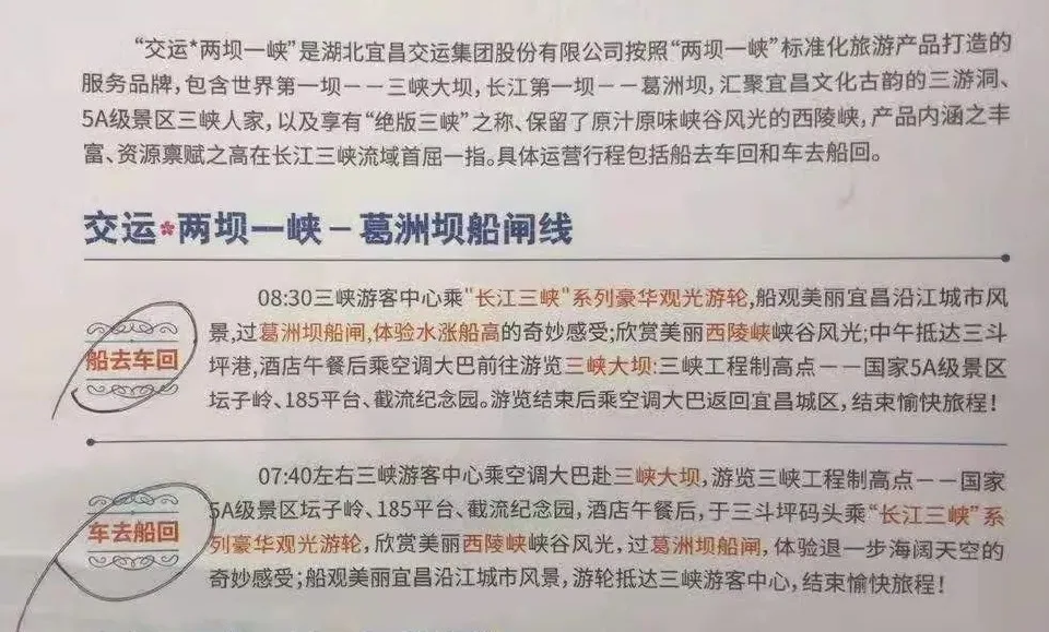 5日两坝一峡:07:10集散中心,08:00登船,08:30出发,09:15葛洲坝,11:07三峡人家,12:15三斗坪转大巴;12:48三峡工程酒店午餐,13:20换乘中心,13:49登上坛子岭,14:35 185平台,15:00截流园,15:35出园,17:10回到码头。