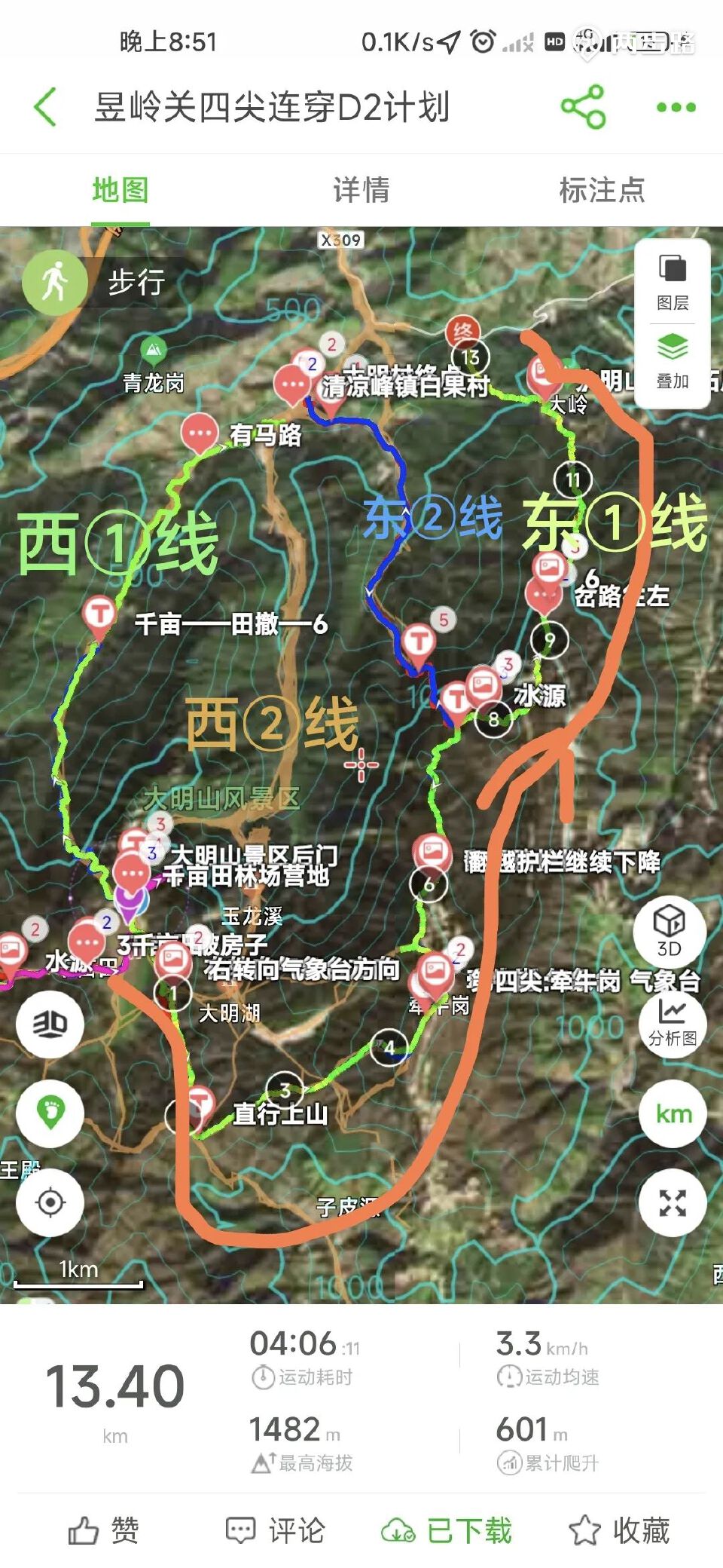 按照计划,我们次日是睡到自然醒后,从四条线下山路中西①线下(减少景区收费的麻烦)。