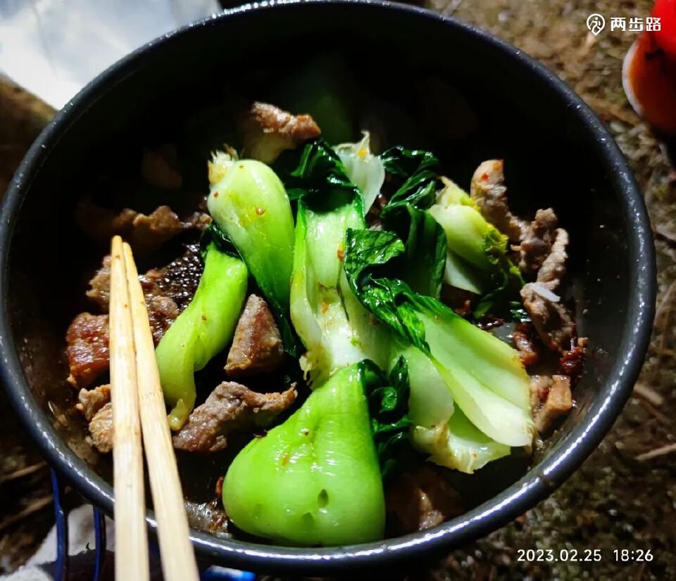 千亩田护林站,管理人员不在,塔坪和后面的小木屋被我们占领(嘉木大哥、硕哥和我一间)。晚餐为上海青炒肉(+嘉木大哥的牛肉片)。没经验,带了一斤瘦肉,炒起来没油不说了,还干噗噗的。。。