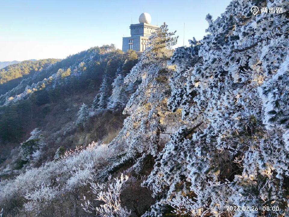 走出树林,看到标志性气象站的同时,冰天雪地的雾凇盛况,再次出现!